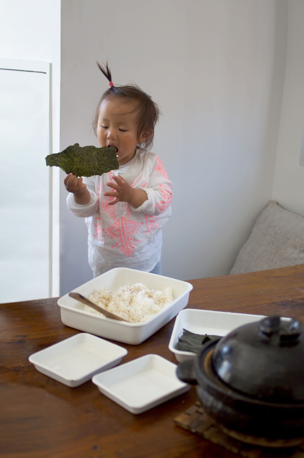 We made Botamochi, which is a seasonal treat (spring) made with sweet rice (brown rice, home-made amazake (no sugar added)) and sweet azuki (red bean) paste. http://en.wikipedia.org/wiki/Botamochi