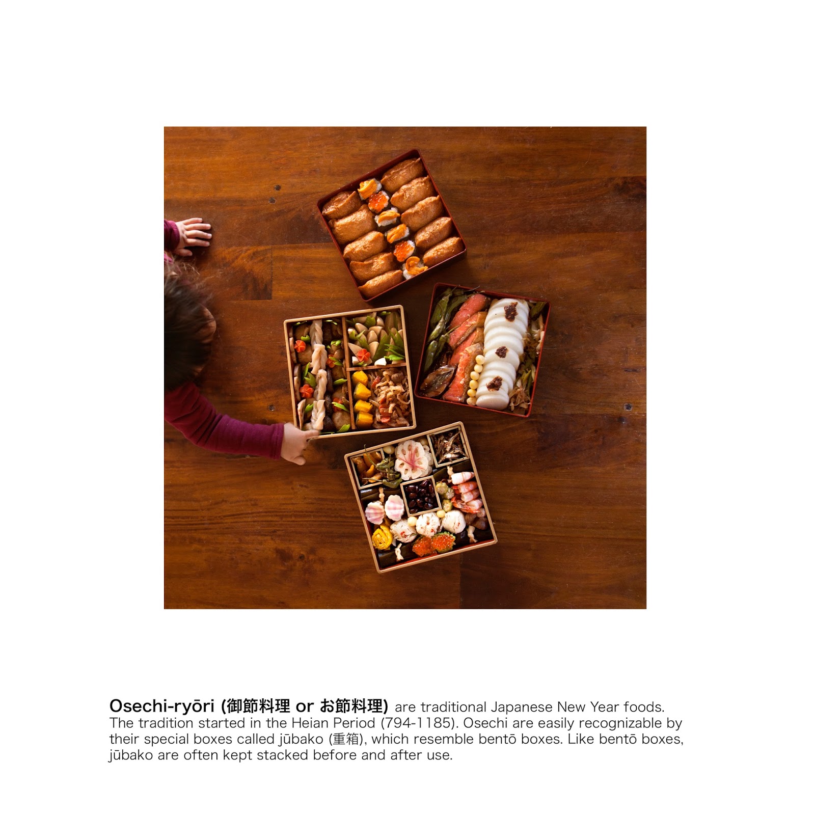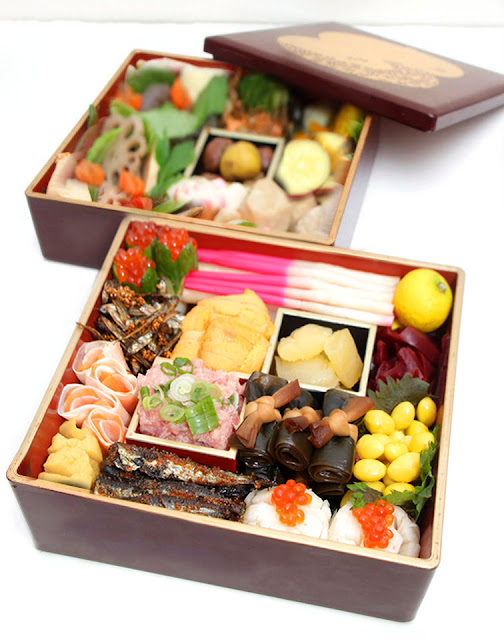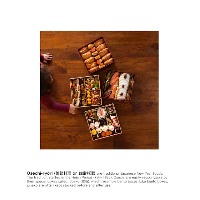 Osechi-ryōri are traditional Japanese New Year foods. The tradition started in the Heian Period (794-1185). Osechi are easily recognizable by their special boxes called jūbako, which resemble bentō boxes. Like bentō boxes, jūbako are often kept stacked before and after use.